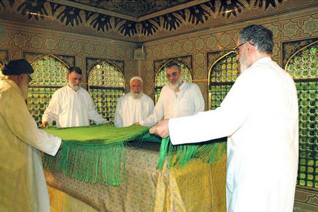 از راست: آیات واعظ طبسی، هاشمی شاهرودی، (ناشناس)، رسولی و مرتضوی در مراسم غبار روبی ضریح مطهر امام رضا (ع)