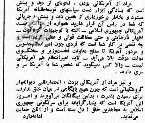 «طنز آقای بازرگان، آنجا که از انتساب آشوبگران به آمریکا برمیآشوبند خود حکایتگر نوعی نگرش آمریکائی به مسائل است. می گویند: «این جوانان جانباز! در خانوادههای آمریکایی زاده نشده و برنگشتهاند که بتوان مزدورشان خواند» … این سؤالها جا دارد که: آیا شاه مخلوع که گوی سبقت را از همه حکمرانان جهان سوم در سوق دادن کشور به سوی وابستگی تام به غرب و خصوصاً امریکا و رواج فرهنگ مصرفی به عنوان پایه وابستگی ربوده بود، در خانواده آمریکایی زاده شده یا از آمریکا برگشته بود یا اینکه شاه آمریکایی نبود؟» ۵