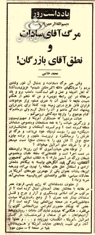 یادداشت خاتمی تحت عنوان «مرگ سادات و نطق آقای بازرگان» نگاشته شد. خاتمی در آغاز این یادداشت اشارهای به مرگ انور سادات، دیکتاتور مصری، که آن روزها کشته شده بود، میکند و از طرفی نطق بازرگان را بهانهای میداند که میتواند هم درباره سادات بنویسد و هم درباره ماجرای بازرگان.