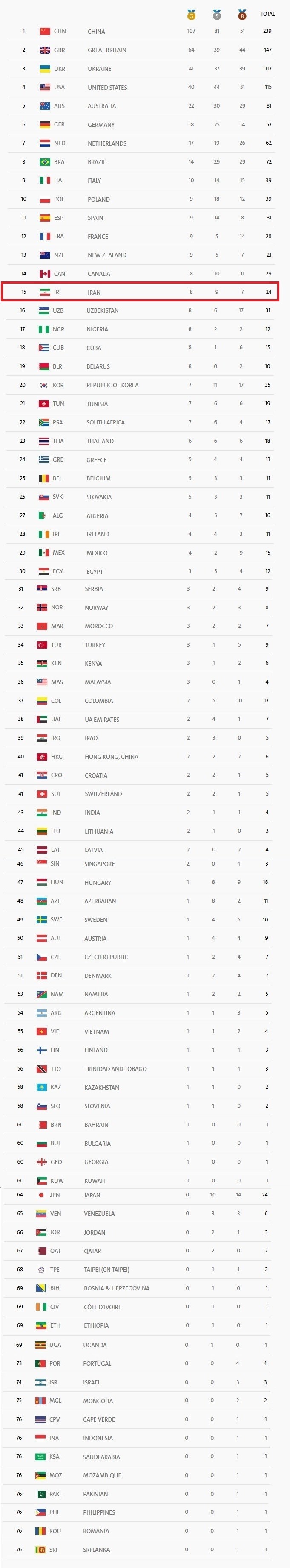 در جدول زیر رتبه و وضعیت تمامی کشورهای شرکت کننده در پارالمپیک ۲۰۱۶ ریو را مشاهده میکنید که ایران در رتبه پانزدهم قرار دارد.