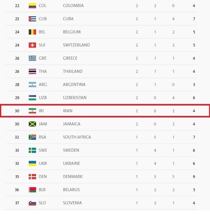 رتبه ۳۰ برای کاروان ایران در جدول توزیع مدالها