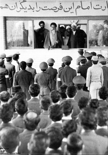 ۱۹ بهمن ۱۳۵۷.مدرسه علوی تهران،آیت الله سید علی خامنه ای درکنار امام خمینی در مراسم بیعت همافران با ایشان