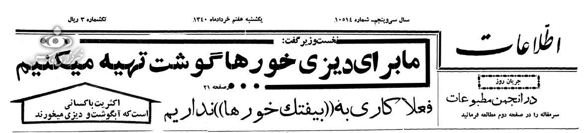 مثلا راجع به گوشت، خوب اگر ما بتوانیم و مشغول هم هستیم که این گوشت آبگوشتی مردم را تامین کنیم. بیفتک[۳] کیلویی هشت تومان-ده تومان، هر کس میخواهد بخورد برود بخورد، ما با بیفتک کاری نداریم. چون بیفتکخور و گوشت گوسالهخور در این مملکت تعدادش محدود است و مسلماً از ۱۰۰ هزار نفر تجاوز نمیکند اما ما دو میلیون نفر آدم در تهران داریم که باید فکر آنها را بکنیم چون فقط گوشت آبگوشتی میخواهند.»