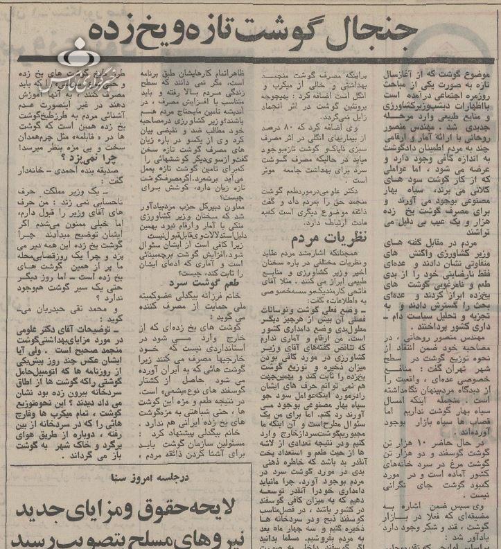 این مصاحبه و خبر اولیه منتشر شده نشان میدهد که در آن زمان کمبود گوشت وجود داشته و البته دولت سعی داشته از طریق واردات گوشت یخزده، بازار را کنترل کنند، اما مردم اقبال زیادی به گوشت وارداتی نداشتهاند.