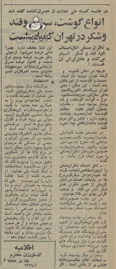 روزنامه اطلاعات در ۱۹ فروردین ۵۳ گزارشی با تیتر «انواع گوشت، سبزی و قند و شکر در تهران کمیاب است» نوشته است: «هرچه در دهان گشوده و آزمند تهران بریزید باز فریاد «نیست و کم است» از این دهان بلند است. این دهان، یعنی تهران بزرگ هماکنون با کمبود ماهی، گرانی سبزیجات، کمبود مرغ، گوشت گوسفند و قند و شکر مواجه است. مقامات مسئول اظهار عقیده میکنند گوشت به اندازه مصرف پایتخت وجود دارد، اما در واقع مردم گوشت به اندازه کافی پیدا نمیکنند.»