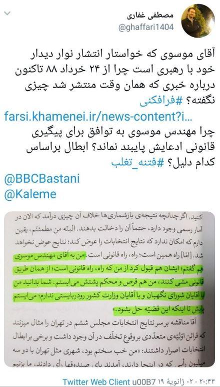 در پی انتشار این توئیت، مصطفی غفاری، نویسنده کتاب فتنه تغلب با انتشار توئیتی بخشی از بیانات رهبر انقلاب پیرامون صحبتهایشان با موسوی را به اشتراک گذاشت و نوشت:
