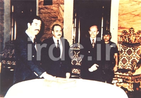 صدام حسین به اتفاق دو تن از مقامات عراقی در حال سوگند خوردن به قرآن برای لغو قرارداد ۱۹۷۵ الجزایره میان ایران و عراق