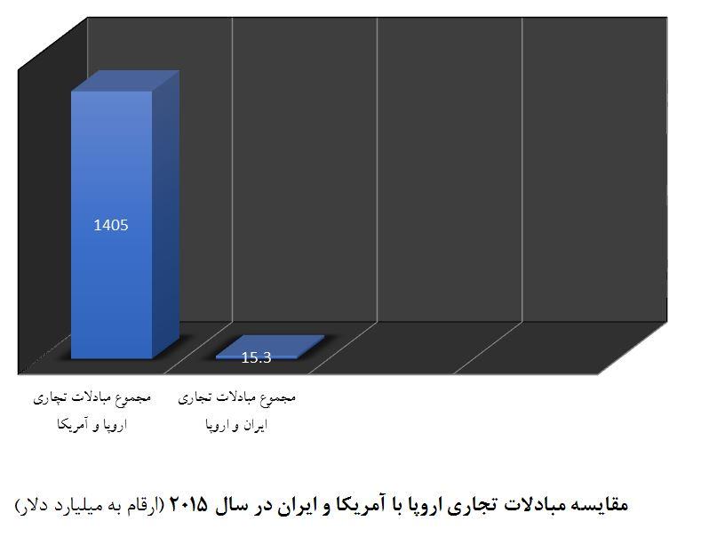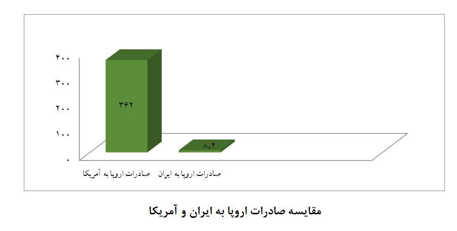 این گزارش همچنین افزوده است که واردات اروپا از آمریکا، در سال ۲۰۱۶ میلادی ۲۴۶ میلیارد یورو در حالی که واردات اروپا از ایران، در همان سال تنها ۵.۵ میلیارد یورو بوده است. این امر حکایتگر وابستگی اروپا به آمریکا نسبت به ایران است.