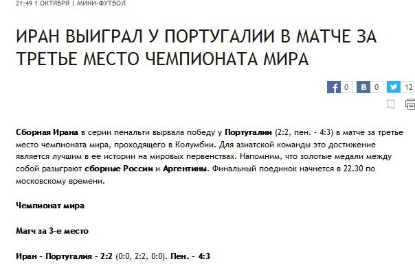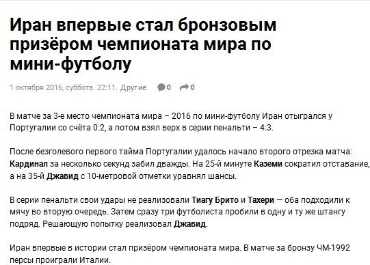 این روزنامه روسی در ادامه این خبر نوشت: تیم ملی فوتسال ایران در بازی ردهبندی جام جهانی ۱۹۹۲ برابر ایتالیا مغلوب شد، اما این بار پرتغال را شکست داد تا مدال تاریخی را کسب کند.