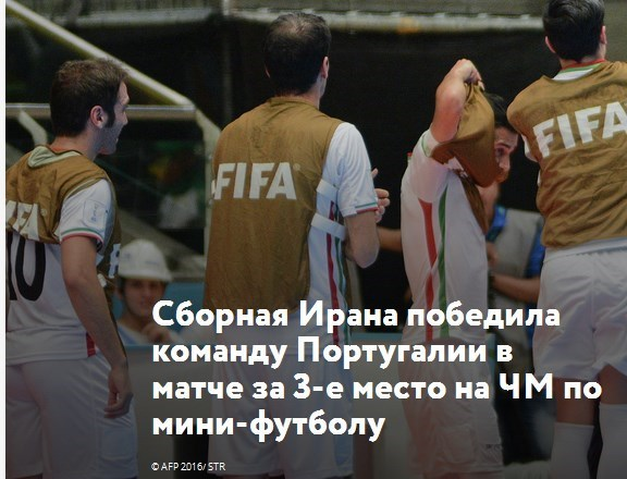 به گزارش خبرگزاری تسنیم، رسانههای ورزشی روسیه کسب عنوان سومی ایران در جام جهانی ۲۰۱۶ کلمبیا با شکست پرتغال در ضربات پنالتی را افتخاری بزرگ برای کشورمان عنوان کردند که برای اولین بار به دست آمد.