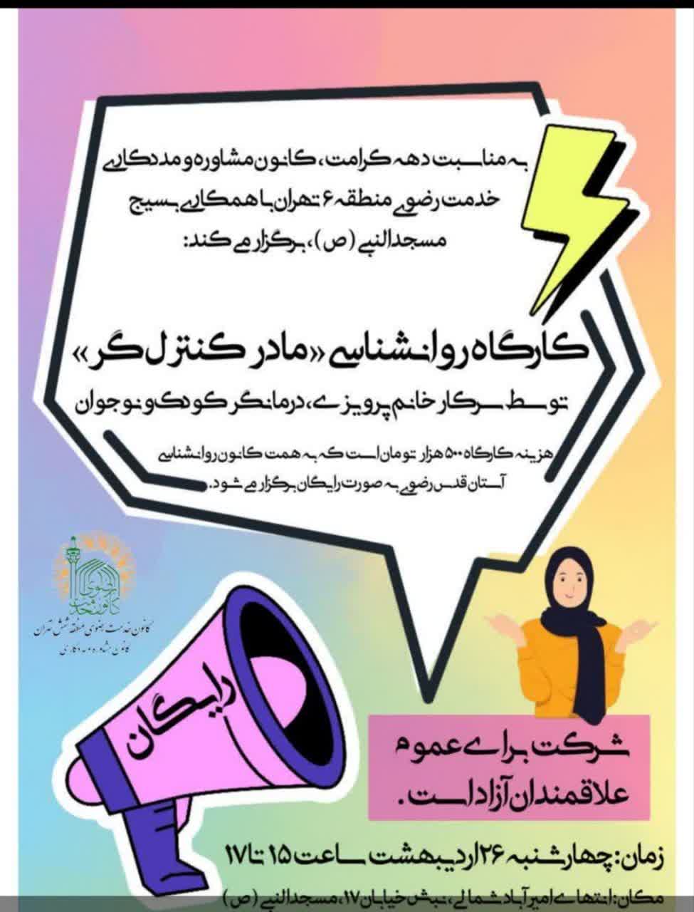 به گزارش آسمانی نیوز، همزمان با چهارشنبه امام رضایی و در ششمین روز از دهه کرامت خادمیاران کانون مشاوره و مددکاری منطقه ۶ تهران با همکاری بسیج مسجد النبی (ص) کارگاه روانشناسی با محوریت مادر کنترلگر را برگزار کرد.