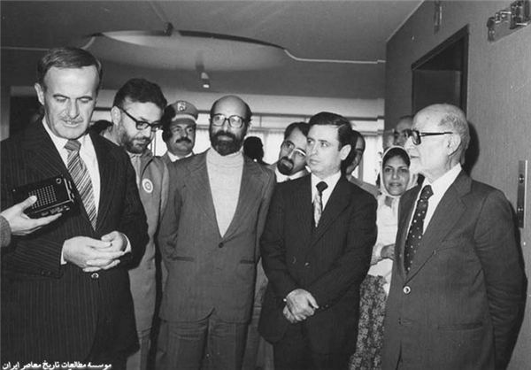 شهید دکتر مصطفی چمران در کنار نخست وزیر دولت موقت در ملاقات با حافظ اسد در سفر به الجزایر