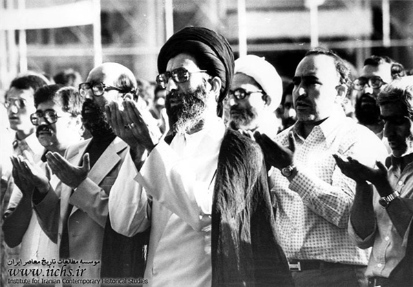 شهید دکتر مصطفی چمران در اقتدا به آیت الله خامنه ای در یکی از مراسم نماز جمعه در دانشگاه تهران