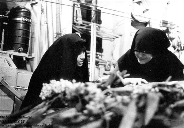 غاده جابر و فاطمه نواب صفوی (فرزند شهید نواب صفوی) در کنار پیکر شهید دکتر مصطفی چمران