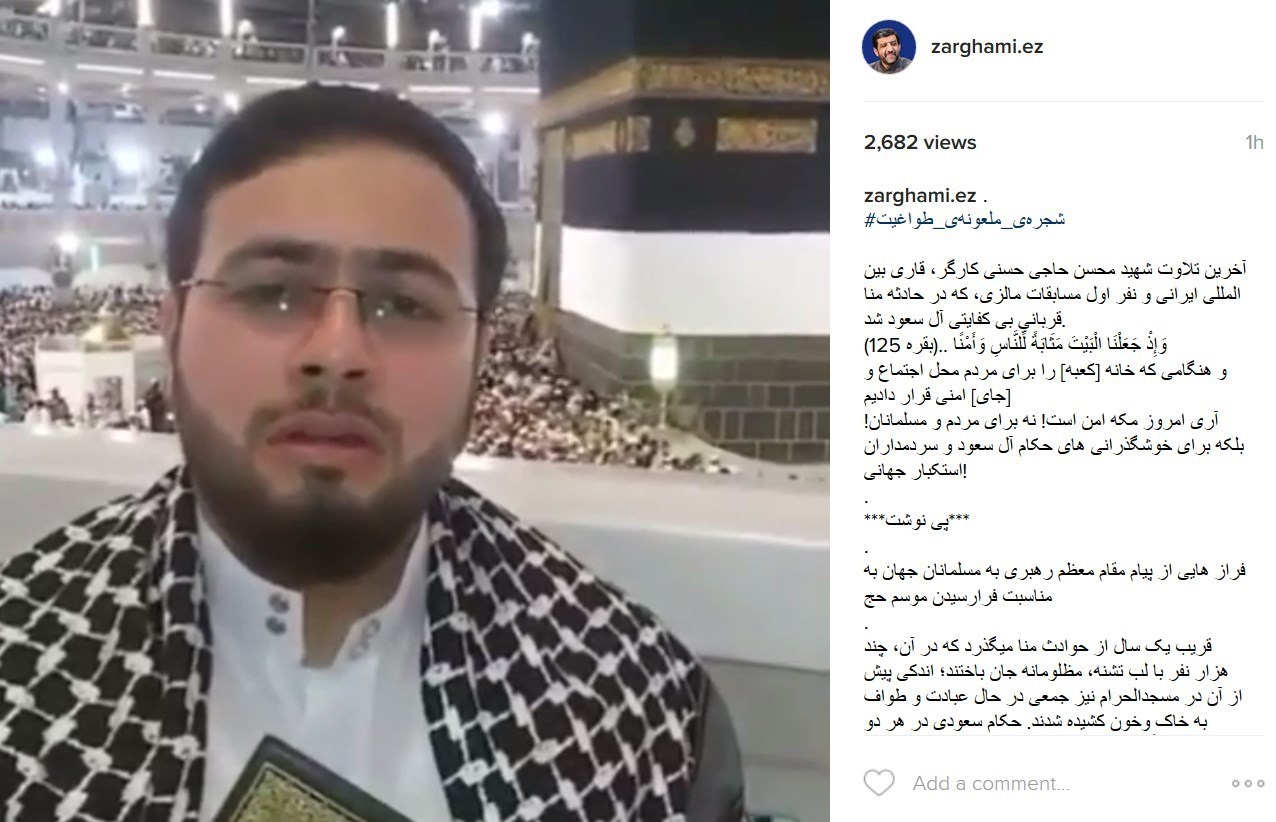 آخرین تلاوت شهید محسن حاجی حسنی کارگر، قاری بین المللی ایرانی و نفر اول مسابقات مالزی، که در حادثه منا قربانی بی کفایتی آل سعود شد.