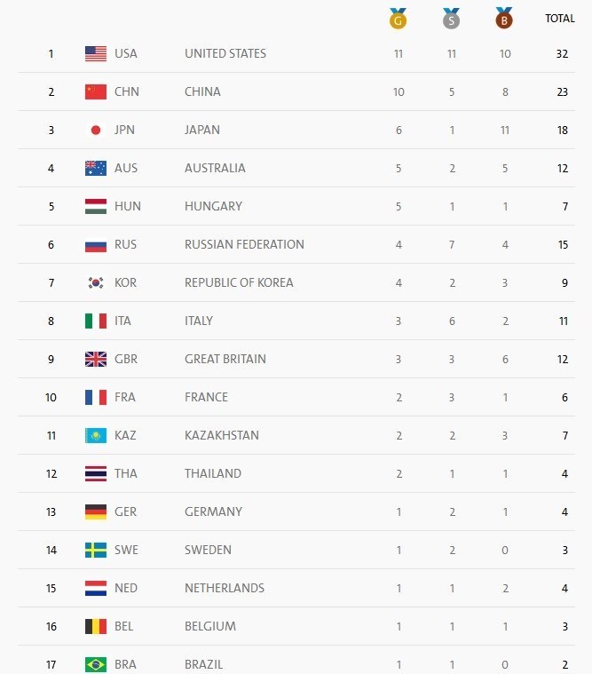 ردهبندی مدالآورترین کشورهای المپیک ۲۰۱۶ ریودوژانیرو در پایان روز پنجم به شرح زیر است: