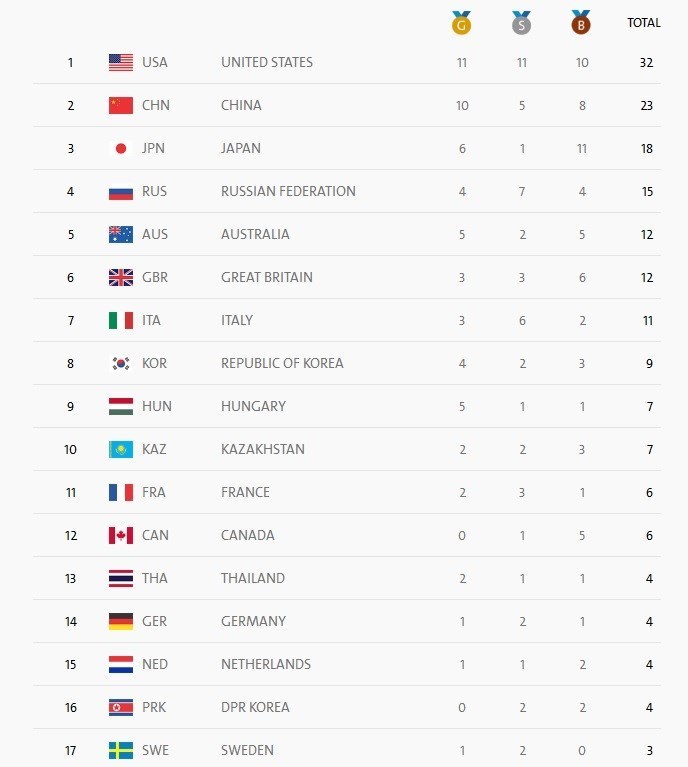 به گزارش خبرگزاری تسنیم، بازیهای روز پنجم المپیک ۲۰۱۶ ریودوژانیرو در شرایطی به پایان رسید که کاروان آمریکا با ۱۱ امتیاز طلا، همین تعداد مدال نقره و ۱۰ مدال برنز بالاتر از رقیب اصلیاش چین که یک مدال طلا، ۶ مدال نقره و دو مدال برنز کمتر کسب کرده است، در صدر جدول قرار گرفت.