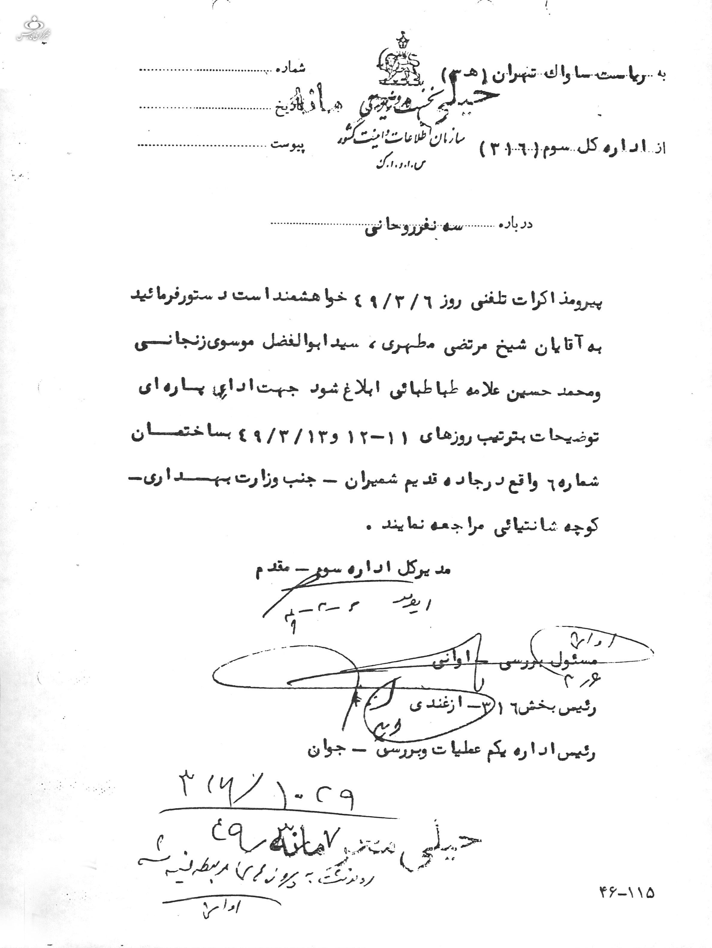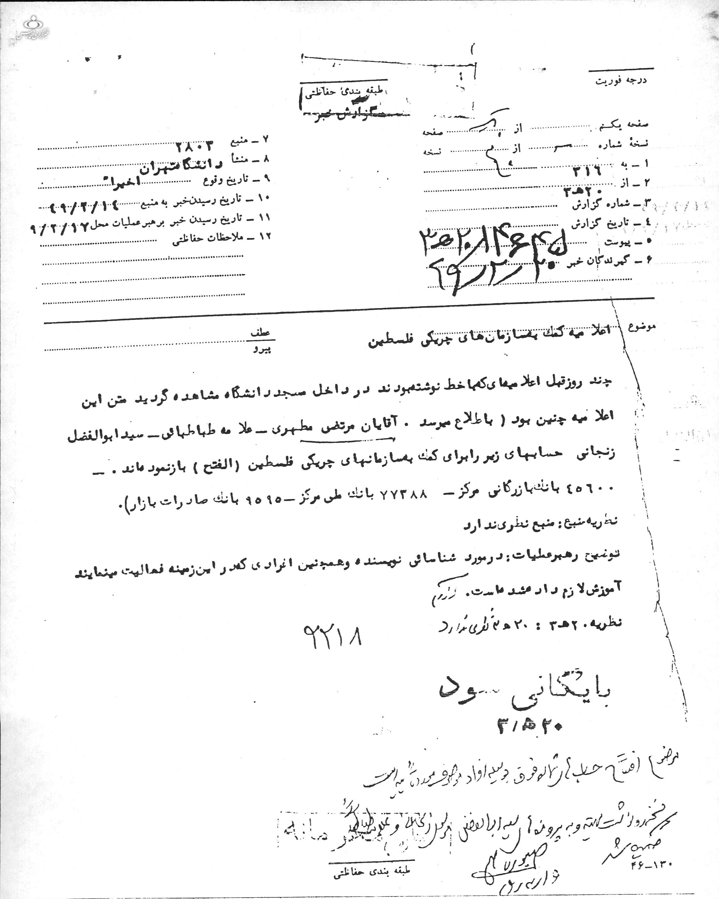 ساواک این عمل را که در اردیبهشت ماه سال ۱۳۴۹ صورت گرفته است، گزارش کرده است. در این اسناد منتشر نشده که از طریق مؤسسه مطالعات و پژوهشهای سیاسی در اختیار فارس قرار گرفته آمده است: «چند روز قبل اعلامیه ای که با خط نوشته بودند، در داخل مسجد دانشگاه مشاهده گردید؛ متن این اعلامیه چنین بود: (به اطلاع میرسد آقایان مرتضی مطهری، علامه طباطبایی، سید ابوالفضل زنجانی حسابهای زیر را برای کمک به سازمانهای چریکی فلسطین (الفتح) باز نمودهاند.)»