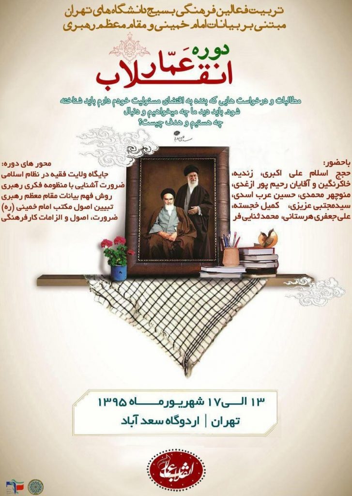 همچنین مطالبات رهبر معظم انقلاب از جوان بسیجی دانشجو، اصول انقلاب اسلامی و دلایل ماندگاری آن و نیز مکتب فکری امام خمینی از دیدگاه آیت الله خامنهای از جمله موضوعات دیگری است که در این دوره به بحث و بررسی گذاشته میشوند.