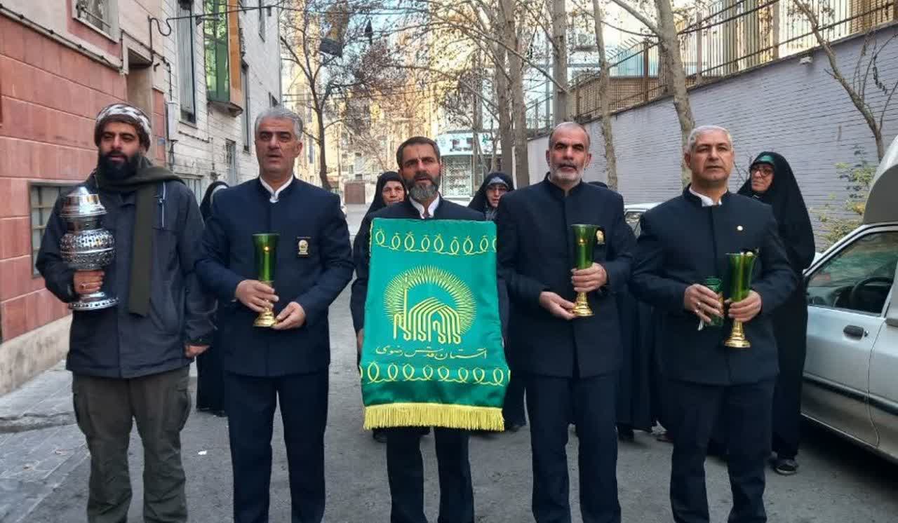 خادمیاران با پرچم متبرک آستان قدس رضوی، شمعدان، اسپندان، گلاب، رضا جان گویان و با نوای” ای صفای قلب زارم” به دیدار خانواده معظم شهدا رفتند و مورداستقبال آنان قرارگرفتند.