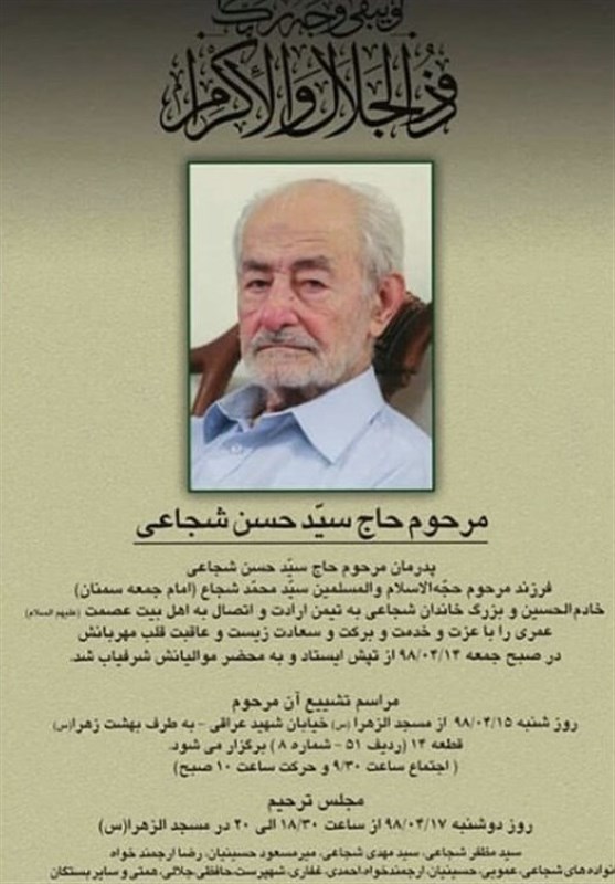 مراسم ختم مرحوم شجاعی روز دوشنبه ۹۸/۴/۱۷ از ساعت ۱۸:۳۰ الی ۲۰ در مسجد الزهرا(س) و مراسم شب هفت روز پنج‌شنبه ۹۸/۴/۲۰ از ساعت ۱۸:۳۰ الی ۲۰ در مسجد علی بن موسی الرضا (ع)، واقع در میدان شهدا خیابان شهید قادری برگزار می‌شود.