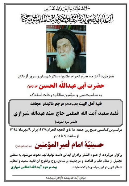 به گزارش خبرنگار تاریخ خیرگزاری فارس، همزمان با آغاز ماه محرم الحرام، عاشورا سالار شهیدان و سرور آزادگان حضرت ابی عبدالله الحسین به مناسبت سیوسومین سالگرد رحلت فقیه اهل البیت(ع) مرجع عالیقدر آیتالله العظمی حاج سید عبدالله شیرازی مراسم بزرگداشتی صبح روز ۲۸ ذی الحجه برابر با ۹ مهر ماه ۱۳۹۵ از ساعت ۹ تا ۱۱ صبح در حسینیه امام امیر المومنین برگزار میشود.