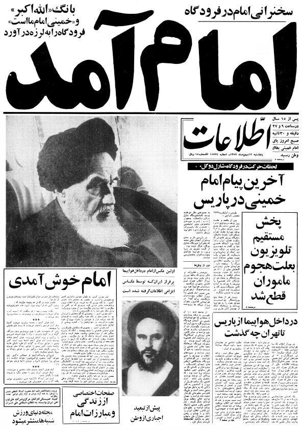 امام خمینی پس از ۱۵ سال تبعید، به کشور بازگشتند. «اطلاعات» در گزارش در این باره نوشته است: «ساعت ۹ و ۵ دقیقه بامداد امروز غرش هواپیمای ایر فرانس در آسمان تهران و بر فراز فرودگاه مهرآباد، تاریخ ایران را ورق زد: انتظار تمام شد و همزمان با طنین غرش هواپیما، فریادهای شادی مردم نیز به آسمان برخاست و طنین این فریادها، نهتنها غرش هواپیما را تحتالشعاع قرار داد، بلکه موج صدای آن، تا کیلومترها آنسوتر را درنوردید.