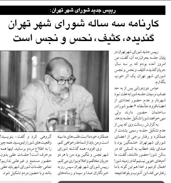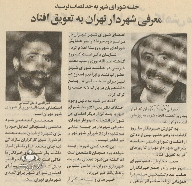 روزنامه نشاط در گزارشی از نحوه انتخاب اولین شهردار در اولین شورای شهر در سال ۷۸ مینویسد: «سه شب پیش در جلسهای در غرب تهران هنگامی که اعضای شورای شهر در یکی از خانهها دور همجمع شدند تا درباره انتخاب شهردار آینده تهران به یک تصمیمگیری مقدماتی برسند، دو پیغام به شورا رسیده بود: نخست پیام غلامحسین کرباسچی از زندان اوین که محمد عطریانفر را توصیه کرده بود و دوم پیام اکبر هاشمی رفسنجانی از مجمع تشخیص مصلحت نظام که محمد غرضی را انتخاب مناسب دانسته بود. اعضای متمایل به حزب کارگزاران با شنیدن این دو پیام کوشیدند مخالفت جدی خود را با فخرالدین دانش آشتیانی، کاندیدای جبهه مشارکت، نشان دهند. کار تا به آنجا پیش رفت که عبدالله نوری، رئیس شورای شهر تهران، استعفانامه خود را در همان شب نوشت.»