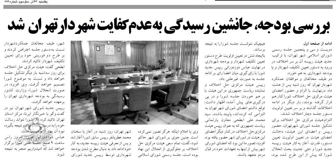 در شورای شهر فعلی نیز آش اختلافات آنقدر شور شد که شهردار اسبق تهران، غلامحسین کرباسچی، در یادداشتی تنها دستاورد این شورا را پرداخت حقوق پرسنل خواند و نوشت: «به جای معرفی ۲۸ نفر و این همه بحث وجدل و بگومگو کردن باید کار مفیدی را انجام دهند؛ حتی اگر ناچار شوند ۲۴ ساعت جلسه بگذارند باید این کار با فوریت و وقتگذاری بیشتر انجام شود و یک شخص توانمند را انتخاب کنند. یک سال از عمر شورا گذشت و در این مدت هم اتفاق خاصی رخ نداده و تنها افتخار این است که موفق شدیم حقوق پرسنل را پرداخت کنیم!»