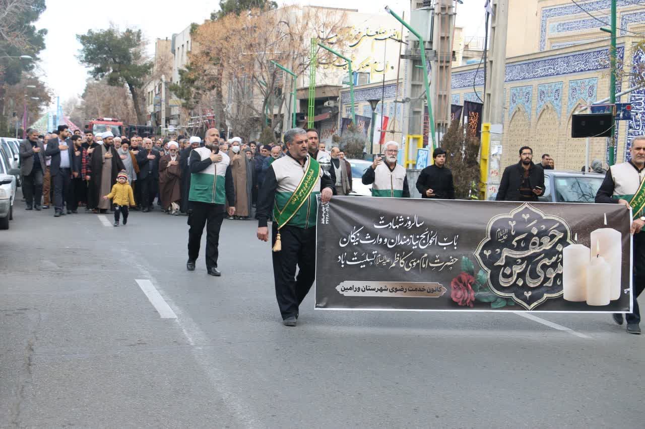 سید یدالله حسینی دبیر کانونهای خدمت رضوی شهرستان ورامین ضمن عرض تسلیت شهادت پدر گرانقدر حضرت رضا علیه السلام حضور خادمیاران کانون خدمت رضوی این شهر در مراسم شهادت این امام همام و برافراشتن پرچم عزا را وظیفه ذاتی این خادمیاران در جهت عرض تسلیت و همدردی با حضرت رضا علیه السلام عنوان کرد و گفت : ما باید سیره زندگی نبوی امام موسی کاظم(ع) که پدر بزرگوار امام رضا(ع) هستند را بیشتر از پیش به نسل جوان و جامعه شناسانده و رهرو امام باشیم.