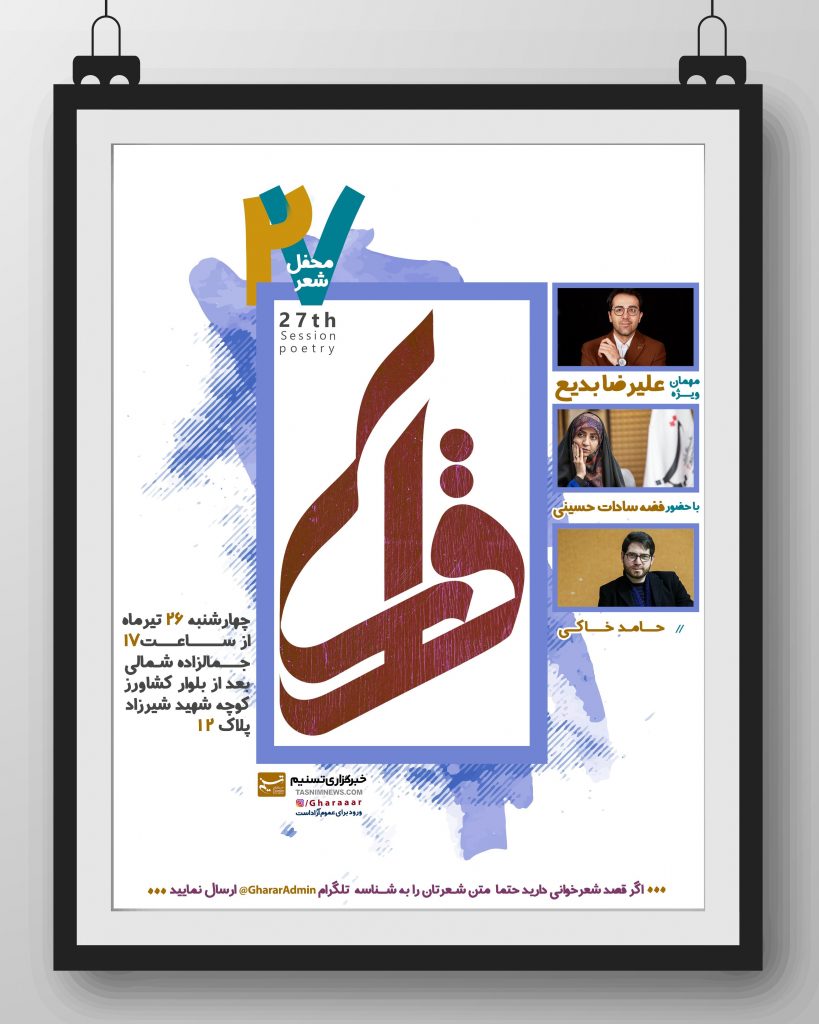 به گزارش خبرنگار فرهنگی باشگاه خبرنگاران پویا، بیست و هفتمین جلسه از محفل شاعرانه «قرار» چهارشنبه ۲۶ تیرماه از ساعت ۱۷ الی ۱۹ در ساختمان باشگاه خبرنگاران تسنیم واقع در خیابان جمالزاده شمالی، بعد از بلوار کشاورز، کوچه شهید شیرزاد، پلاک ۱۲ برگزار میشود.