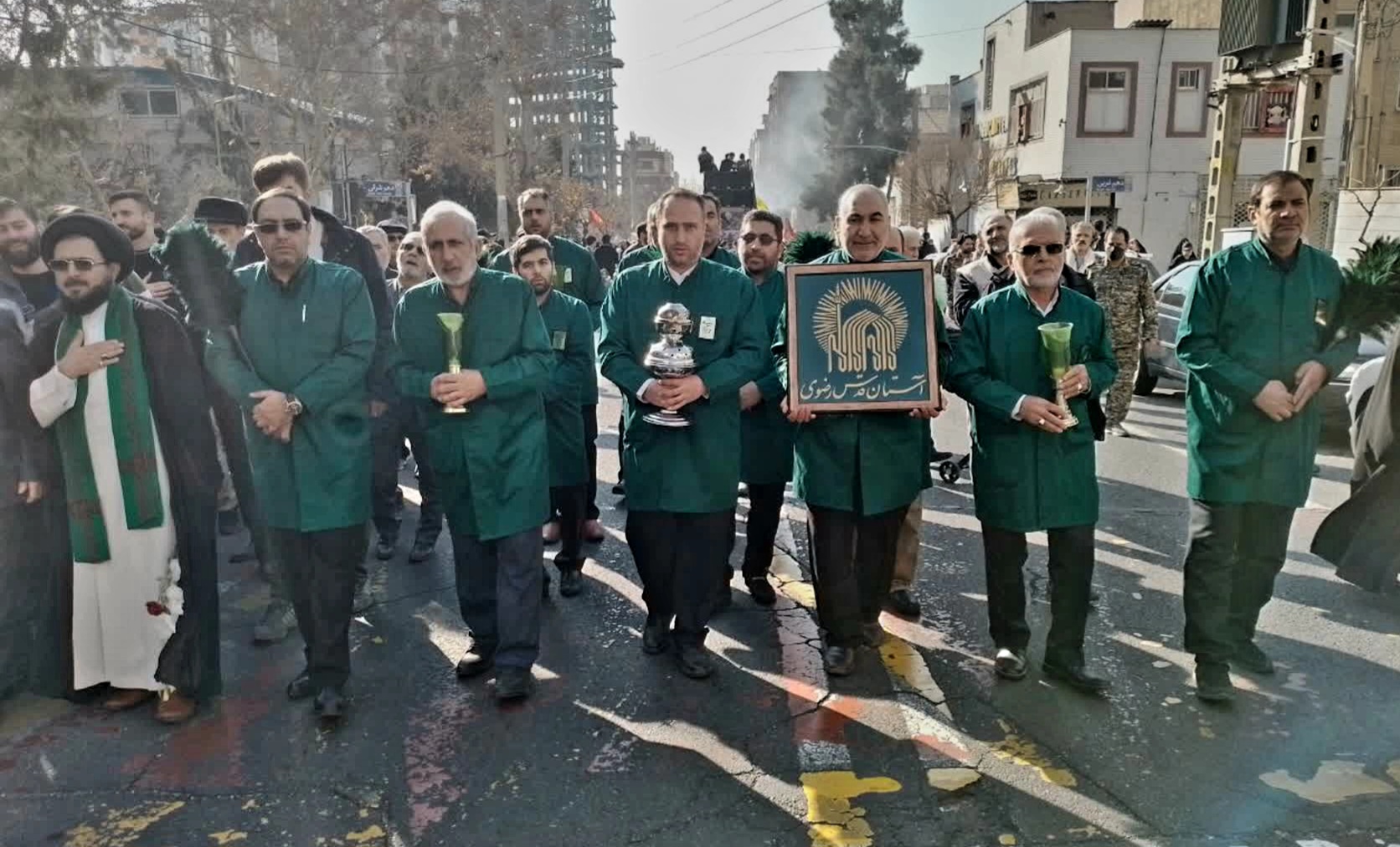خادمیاران رضوی در معیت پرچم متبرک حرم مطهر شمس الشموس از شهید گمنام استقبال و تا آرامگاه ابدی که از قبل آماده و گل آرایی شده بود در بوستان گلدشت محله فردوس بدرقه کردند.