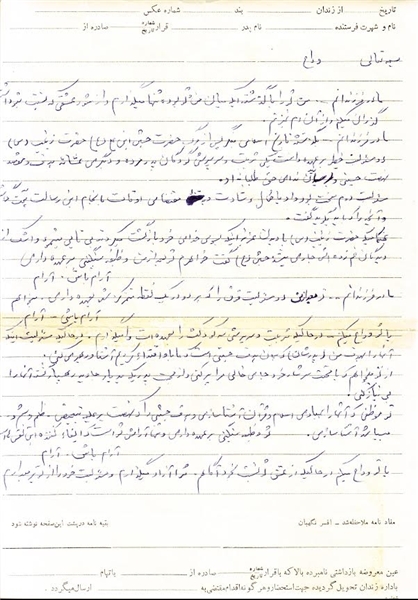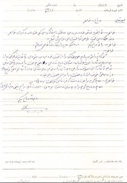 ۳-ادب و نزاکت و آرامش و طمأنینه روحی خاص علیرغم آگاهی از حکم اعدام از ویژگیهای شخصیتی شهید عراقی است که با مطالعه این وداعنامهها به دست میآید.