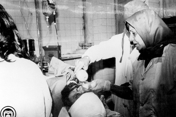 صبحگاه ۲۷ آذر ۱۳۵۸. پیکر شهید آیتالله دکتر محمد مفتح در یکی از بیمارستانهای تهران