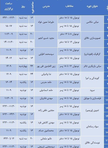 عناوین کلاسها و اسامی مدرسان این دورهها به شرح زیر است: