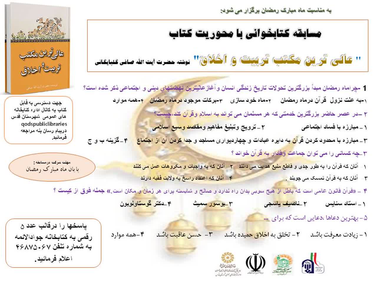 به مناسبت ماه مبارک رمضان، مسابقه کتابخوانی با محوریت کتاب " عالی ترین مکتب تربیت و اخلاق " نوشته آیت الله صافی گلپایگانی به همت کانون خدمت رضوی کتاب و کتابخوانی شهرقدس برگزار میشود.