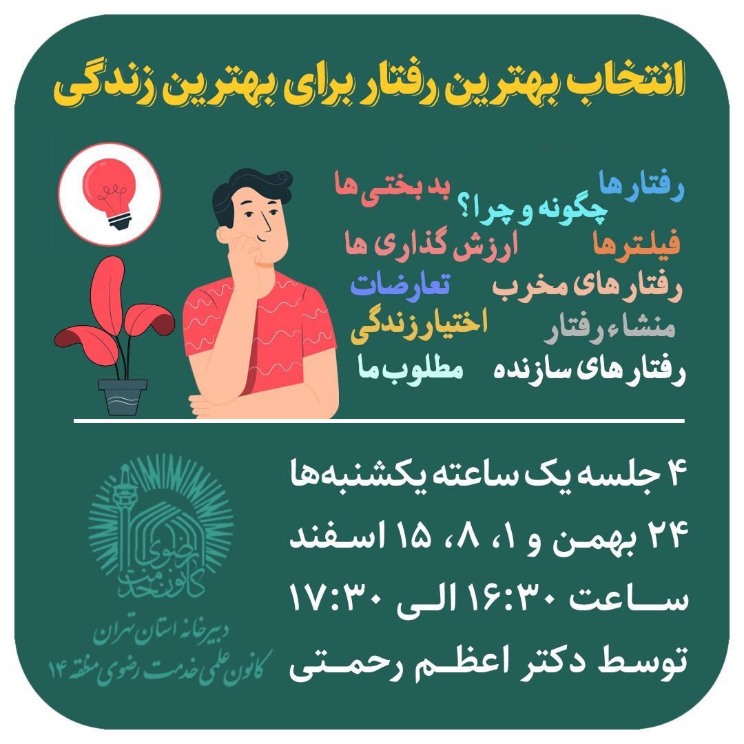 به همت خادمیاران کانون علمی خدمت رضوی منطقه 14 تهران، دوره "انتخاب بهترین رفتار برای بهترین زندگی" برگزار شد.