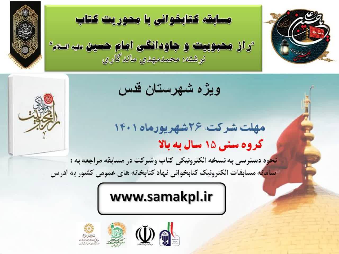 کانون خدمت رضوی کتاب و کتابخوانی شهرستان قدس مسابقه کتابخوانی در راستای شناخت خصوصیات و سیره امام حسین علیه السلام برگزار میکند.